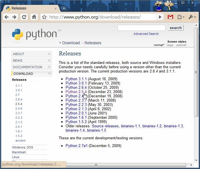 「Python 2.5.4」(2.5台の最新バージョン)のリンクをクリックし、そこからそれぞれのプラットフォーム用のものをダウンロードしてください。ダウンロードした