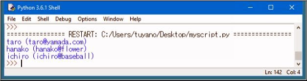 ここでは、それぞれの名前をキーにして、メールアドレスを設定してあります。forを使い、辞書の全データを書きだしています。辞書を使うと、このようにちょっとしたプチ・データベースっぽい使い方ができるようになります。