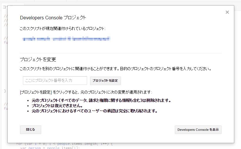 では、プロジェクトを設定しましょう。ダイアログにある「このスクリプトが現在関連付けられているプロジェクト」というところに、プロジェクト名が表示されているでしょうか。表示されていれば、既にプロジェクトへの関連付けは完了しています。