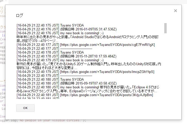 Logger.log('(投稿日時 ' + item.published + ')');