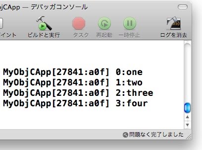NSArray* arr = [NSArray arrayWithObjects:例として、2つのNSArrayを1つにまとめて、その内容を出力するサンプルをあげておきましょう。ここでは、arrayByAddingObjectsFromArray:を使って2つのNSArrayを一つにし、繰り返しで内容を出力しています。