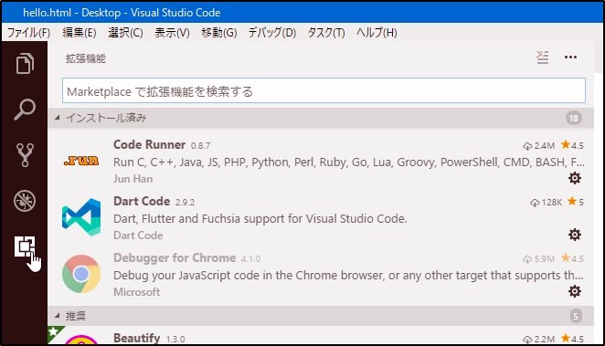 インストールしたら、Visual Studio Codeを起動し、ウインドウの左端にあるアイコンから、一番下の「