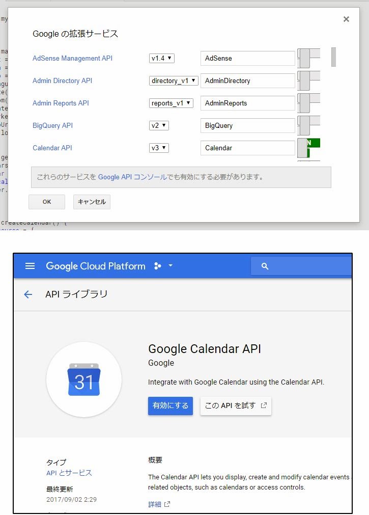 このCalendar APIは、標準ではGoogle Apps Scritpに組み込まれてはいません。利用するためには、2つの作業が必要です。1つは、プロジェクトへの拡張サービスの組み込み、もう1つはGoogleが提供するCalendar APIを有効にすることです。