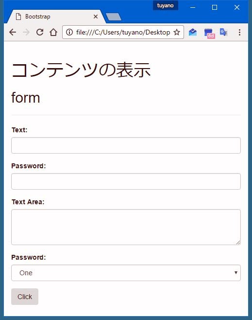 <!DOCTYPE html> <html lang="ja"> <head> <meta charset="utf-8"> <meta http-equiv="X-UA-Compatible" content="IE=edge"> <meta name="viewport" content="width=device-width, initial-scale=1"> <title>Bootstrap</title> <script src="./js/jquery-3.1.1.min.js"></script> <script src="./js/bootstrap.min.js"></script> <link rel="stylesheet" href="./css/bootstrap.min.css"> <link rel="stylesheet" href="./css/bootstrap-theme.min.css"> </head> <body > <div class="container"> <div class="row"> <div class="col-md-12"> <div class="page-header"> <h1>コンテンツの表示</h1> <h2 >form</h2> </div> <form> <div class="form-group"> <label for="txt1">Text:</label> <input type="text" class="form-control" id="txt1"> </div> <div class="form-group"> <label for="pw1">Password:</label> <input type="password" class="form-control" id="pw1"> </div> <div class="form-group"> <label for="ta1">Text Area:</label> <textarea class="form-control" id="ta1" rows="3"></textarea> </div> <div class="form-group"> <label for="sl1">Password:</label> <select class="form-control" id="sl1"> <option>One</option> <option>Two</option> <option>Three</option> </select> </div> <div class="form-group"> <input type="button" class="btn" value="Click"> </div> </form> </div> </div> </div> </body> </html>
