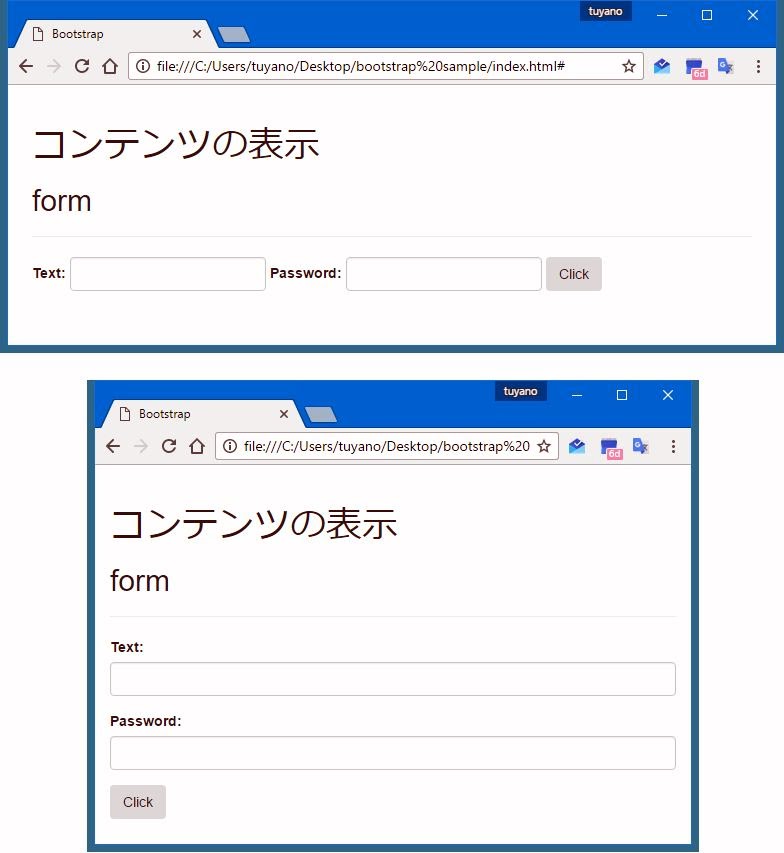 <!DOCTYPE html> <html lang="ja"> <head> <meta charset="utf-8"> <meta http-equiv="X-UA-Compatible" content="IE=edge"> <meta name="viewport" content="width=device-width, initial-scale=1"> <title>Bootstrap</title> <script src="./js/jquery-3.1.1.min.js"></script> <script src="./js/bootstrap.min.js"></script> <link rel="stylesheet" href="./css/bootstrap.min.css"> <link rel="stylesheet" href="./css/bootstrap-theme.min.css"> </head> <body > <div class="container"> <div class="row"> <div class="col-md-12"> <div class="page-header"> <h1>コンテンツの表示</h1> <h2 >form</h2> </div> <form class="form-inline"> <div class="form-group"> <label for="txt1">Text:</label> <input type="text" class="form-control" id="txt1"> </div> <div class="form-group"> <label for="pw1">Password:</label> <input type="password" class="form-control" id="pw1"> </div> <div class="form-group"> <input type="button" class="btn" value="Click"> </div> </form> </div> </div> </div> </body> </html>