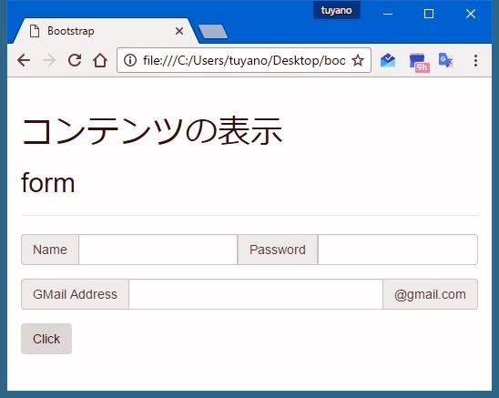 <!DOCTYPE html> <html lang="ja"> <head> <meta charset="utf-8"> <meta http-equiv="X-UA-Compatible" content="IE=edge"> <meta name="viewport" content="width=device-width, initial-scale=1"> <title>Bootstrap</title> <script src="./js/jquery-3.1.1.min.js"></script> <script src="./js/bootstrap.min.js"></script> <link rel="stylesheet" href="./css/bootstrap.min.css"> <link rel="stylesheet" href="./css/bootstrap-theme.min.css"> </head> <body > <div class="container"> <div class="row"> <div class="col-md-12"> <div class="page-header"> <h1>コンテンツの表示</h1> <h2 >form</h2> </div> <form> <div class="form-group input-group"> <span class="input-group-addon">Name</span> <input type="text" class="form-control"> <span class="input-group-addon">Password</span> <input type="password" class="form-control"> </div> <div class="form-group input-group"> <span class="input-group-addon">GMail Address</span> <input type="text" class="form-control"> <span class="input-group-addon">@gmail.com</span> </div> <div class="form-group"> <input type="button" class="btn" value="Click"> </div> </form> </div> </div> </div> </body> </html>