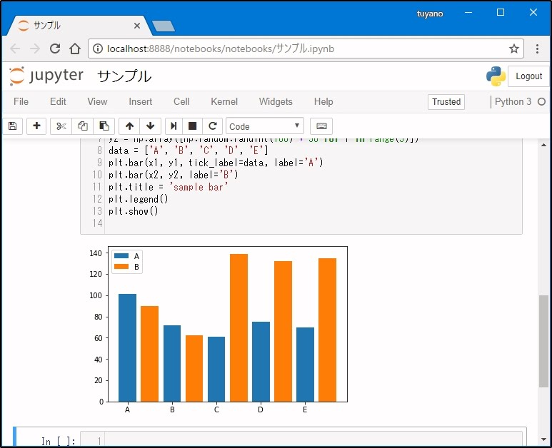 import numpy as np import matplotlib.pyplot as plt x1 = [0, 2, 4, 6, 8] x2 = [1, 3, 5, 7, 9] y1 = np.array([np.random.randint(100) + 50 for i in range(5)]) y2 = np.array([np.random.randint(100) + 50 for i in range(5)]) data = ['A', 'B', 'C', 'D', 'E'] plt.bar(x1, y1, tick_label=data, label='A') plt.bar(x2, y2, label='B') plt.title = 'sample bar' plt.legend() plt.show()