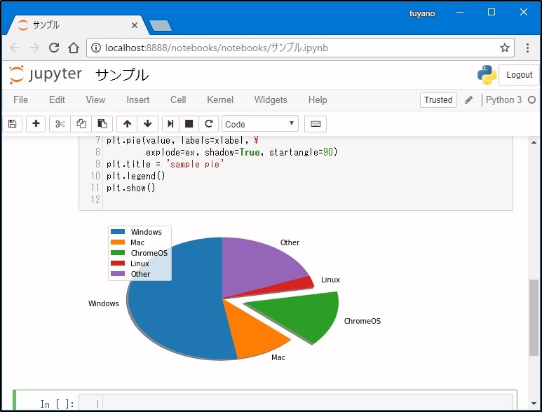 《matplotlib》.pie( データ )非常にシンプルですね。円グラフは割合を示すものですから、複数のデータをひとまとめにしたリストなどを引数に指定すれば、それだけでグラフを作成することができます。ただし、これだけでは本当にただの円グラフだけですから、その他に以下のような引数を用意しておくことが多いでしょう。