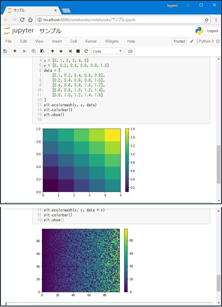 《matplotlib》.pcolormesh( X値 , Y値 , データ )引数には、X軸の値のリストとY軸の値のリスト、そしてそれぞれの座標に割り当てる色の値の2次元リストが用意されます。例えば、