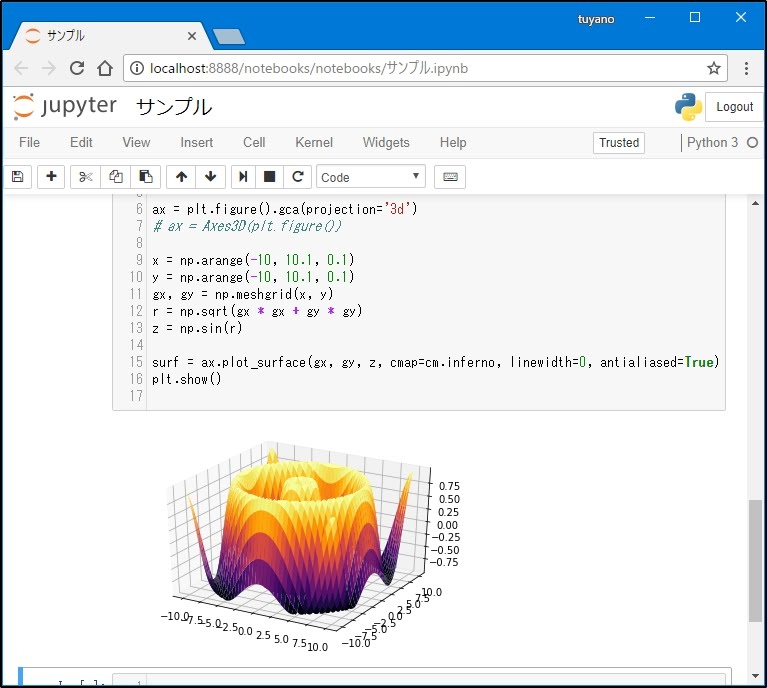 import numpy as np import matplotlib.pyplot as plt from mpl_toolkits.mplot3d import Axes3D from matplotlib import cm ax = plt.figure().gca(projection='3d') # ax = Axes3D(plt.figure()) x0 = np.arange(-10, 10, 0.25) y0 = np.arange(-10, 10, 0.25) x, y = np.meshgrid(x0, y0) z = np.sin(np.sqrt(x * x + y * y)) surf = ax.plot_surface(x, y, z, cmap=cm.inferno, linewidth=0, antialiased=True) plt.show()