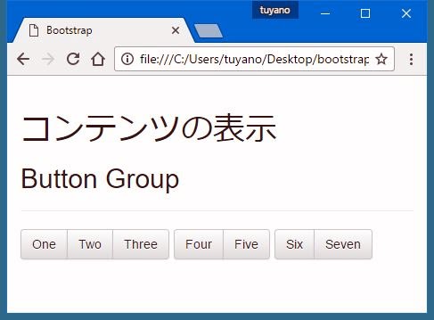 <!DOCTYPE html> <html lang="ja"> <head> <meta charset="utf-8"> <meta http-equiv="X-UA-Compatible" content="IE=edge"> <meta name="viewport" content="width=device-width, initial-scale=1"> <title>Bootstrap</title> <script src="./js/jquery-3.1.1.min.js"></script> <script src="./js/bootstrap.min.js"></script> <link rel="stylesheet" href="./css/bootstrap.min.css"> <link rel="stylesheet" href="./css/bootstrap-theme.min.css"> </head> <body > <div class="container"> <div class="row"> <div class="col-md-12"> <div class="page-header"> <h1>コンテンツの表示</h1> <h2 >Button Group</h2> </div> <div class="btn-toolbar"> <div class="btn-group"> <button class="btn btn-default">One</button> <button class="btn btn-default">Two</button> <button class="btn btn-default">Three</button> </div> <div class="btn-group"> <input type="button" class="btn btn-default" value="Four"> <input type="button" class="btn btn-default" value="Five"> </div> <div class="btn-group"> <div class="btn btn-default">Six</div> <div class="btn btn-default">Seven</div> </div> </div> </div> </div> </div> </body> </html>