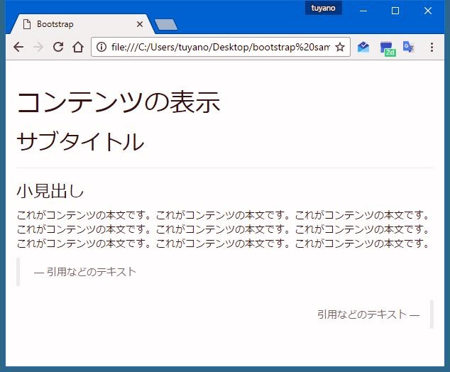 <!DOCTYPE html> <html lang="ja"> <head> <meta charset="utf-8"> <meta http-equiv="X-UA-Compatible" content="IE=edge"> <meta name="viewport" content="width=device-width, initial-scale=1"> <title>Bootstrap</title> <script src="./js/jquery-3.1.1.min.js"></script> <script src="./js/bootstrap.min.js"></script> <link rel="stylesheet" href="./css/bootstrap.min.css"> <link rel="stylesheet" href="./css/bootstrap-theme.min.css"> </head> <body > <div class="container"> <div class="row"> <div class="col-md-12"> <div class="page-header"> <h1>コンテンツの表示</h1> <h2>サブタイトル</h2> </div> <h3>小見出し</h3> <p> これがコンテンツの本文です。これがコンテンツの本文です。 これがコンテンツの本文です。 これがコンテンツの本文です。これがコンテンツの本文です。 これがコンテンツの本文です。 これがコンテンツの本文です。これがコンテンツの本文です。 これがコンテンツの本文です。 </p> <blockquote> <p><small>引用などのテキスト</small></p> </blockquote> <blockquote class="pull-right"> <p><small>引用などのテキスト</small></p> </blockquote> </div> </div> </div> </body> </html>