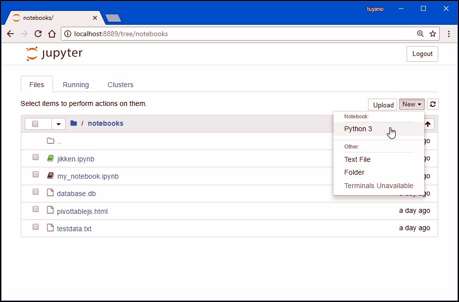 この画面は、Jupyterのノートブックを作成したり、ファイルのリネームや削除といった操作を行うためのものです。要するに、ノートブック用のファイル管理ページですね。ここでノートブック(Jupyterで作るドキュメント)を作成できます。
