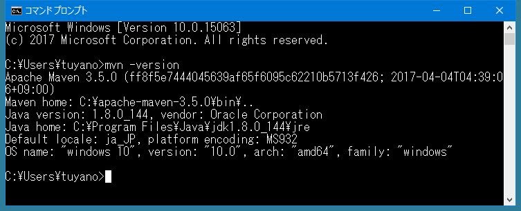 これらが出力されたなら、Mavenへのパスは通っています。実行したらエラーメッセージのようなものが現れたなら、正しくパスが設定されていないか、あるいはJavaのバージョンが古いのかもしれません。環境変数pathに正しくパスが追加されているか、またJavaのバージョンが最新になっているか確認しておきましょう。