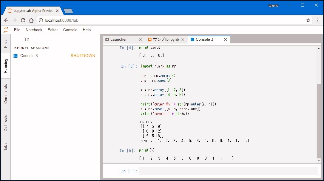 ノートブックと異なり、コンソールは実行結果を保存できません。ただ、その場で実行するだけです。ですから、ノートブックとは別に、ちょっとPythonのコードを実行したい、というような使い方になるでしょう。
