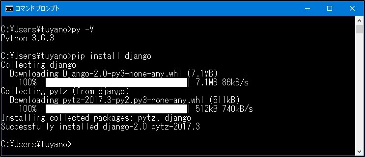 pip install django」だけでも大丈夫です。これで、Django本体と、Django利用に必要なパッケージなどがすべてインストールされます。