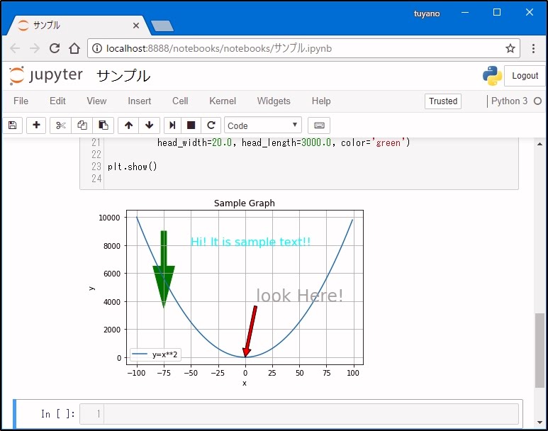 《matplotlib》.text( X座標 , Y座標 , テキスト )テキストを追加します。テキストの座標と表示するテキストを引数に指定します。