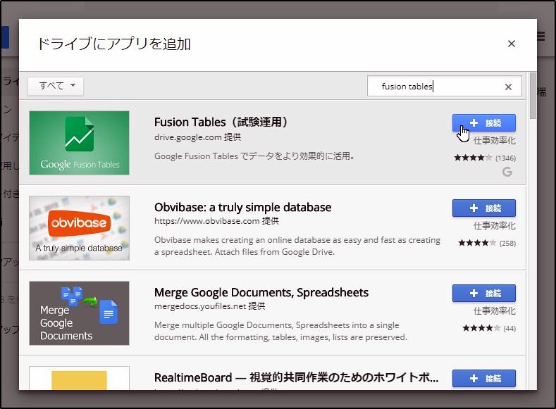 Fusionn Tablesを利用する場合、まずGoogleドライブにアプリを追加しておきましょう。Googleドライブの「新規」ボタンをクリックし、「その他」メニュー内の「アプリを追加」を選んで、アプリケーションを追加するためのダイアログを呼び出します。そこで「fusion tables」を検索し、見つかったアプリの「接続」ボタンをクリックして接続をしましょう。これで、Fusion TablesがGoogleドライブから使えるようになります。