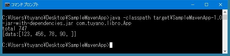 java -classpath target\SampleMavenApp-1.0-jar-with-dependencies.jar com.tuyano.libro.App