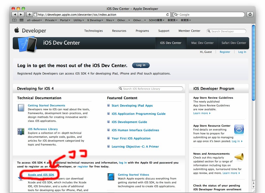 iOS Dev Center」というページが表示されます。これは、iOS開発のための各種情報を提供する総合サイトです。ここから「