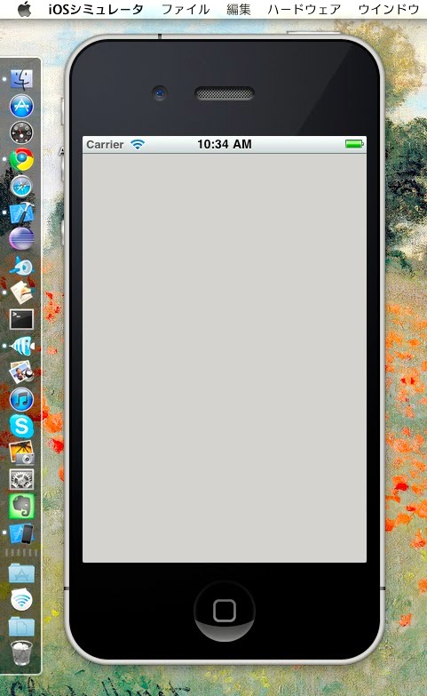 では、ポップアップメニューから動作する環境をきっちり指定したら、「Run」または「ビルドと実行」ボタンを押してください。プロジェクトのビルドを開始し、自動的にプログラムを実行します。iphoneのエミュレータが起動し、そこにアプリが表示されます。といっても、何も表示されない、ただグレーの画面だけですが……。これが、標準で作成されたアプリの画面なのです。