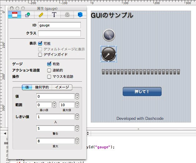インジケータを更に強化したもので、インジケータ内に針とメモリが追加されています。最小値と最大値の情報を持っており、値が増えるごとに針がゼロから次第に増えていき、最大値になった時点で振り切れます。また、インジケータと同様に点灯、警告、重大のしきい値を持っており、それらを超えた時点で表示が緑・黄・赤と変わります。これも「属性」パレットに、各しきい値を設定する項目があります。