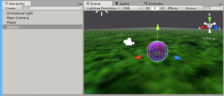 ※作成したシーン。PlaneとSphereを配置する。
