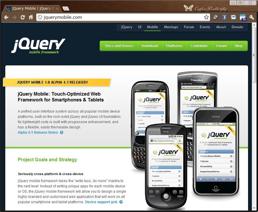 http://jquerymobile.com/jQuery Mobileは、上記のURLにて公開されています。まずはここからファイルをダウンロードし……と、普通ならば説明するのですが、実はjQuery Mobileを利用するのにファイルのダウンロードなどは一切不要です(いえ、まぁダウンロードして自分のWebサイトに組み込んで使うこともできるんですが……普通はそうしないだろう、ってことです)。