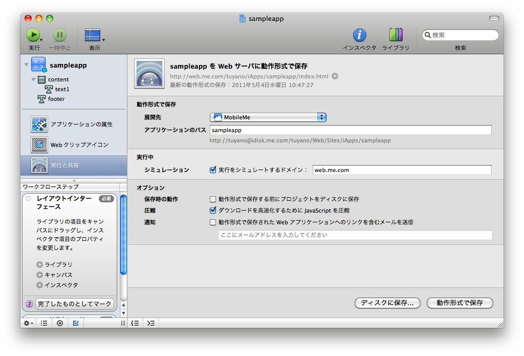Dashcodeの大きな特徴は、単にエミュレータで動作を確認するだけでなく、そのままWebサイトにWebアプリを公開できるという点でしょう。特に、