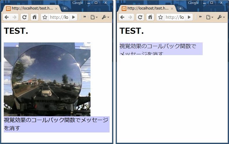 show( ミリ秒数 , 関数 );このように、第2引数に関数を指定することで、エフェクト完了後、これらが呼び出され事後処理を行うようになります。