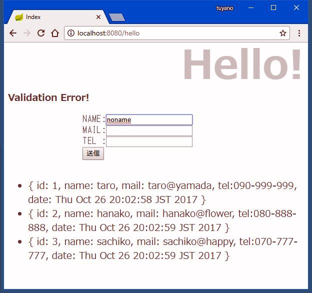 }後は、Setから繰り返しなどで順に値を取り出し処理していくだけですね。では、実際の処理を見てみましょう。for (ConstraintViolation<MyDataEntity> err : errs) {
