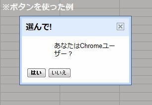 var result = Browser.msgBox("選んで!", "あなたはChromeユーザー?",