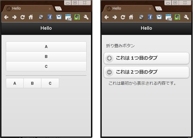 ※グループボタンの例 <div id="home" data-role="page"> <div data-role="header"> <h1>Hello</h1> </div> <div data-role="content"> <div data-role="controlgroup"> <a href="#" data-role="button">A</a> <a href="#" data-role="button">B</a> <a href="#" data-role="button">C</a> </div> <hr /> <div data-role="controlgroup" data-type="horizontal"> <a href="#" data-role="button">A</a> <a href="#" data-role="button">B</a> <a href="#" data-role="button">C</a> </div> </div> </div> ※折り畳みボタンの例 <div id="home" data-role="page"> <div data-role="header"> <h1>Hello</h1> </div> <div data-role="content"> <p>折り畳みボタン</p> <div data-role="collapsible" data-collapsed="true"> <h2>これは1つ目のタブ</h2> <div>これは折りたたまれた内容です。</div> </div> <div data-role="collapsible"> <h2>これは2つ目のタブ</h2> <div>これは最初から表示される内容です。</div> </div> </div> </div>
