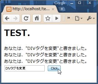 $('タグ名')このような形で記述されていることがわかるでしょう。ここでは$('div').text(値)と実行しています。これで、ページにある全<div>タグの内容が一斉に変更されてしまうのです。$('.クラス名')クラス名の前にドット(.)をつけて記述します。例えば、下のサンプルで、<div>タグを変更している文を以下のように書き換えてみましょう。$('div') → $('.msg')これで、class="msg"と指定されたタグのテキストだけがまとめて変更されます。classが指定されていないものは変わりません。