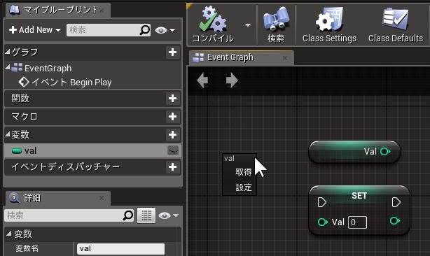 通常、ブループリントはグラフを右クリックして現れるメニューから選んでノードを配置していきます。が、変数は違います。