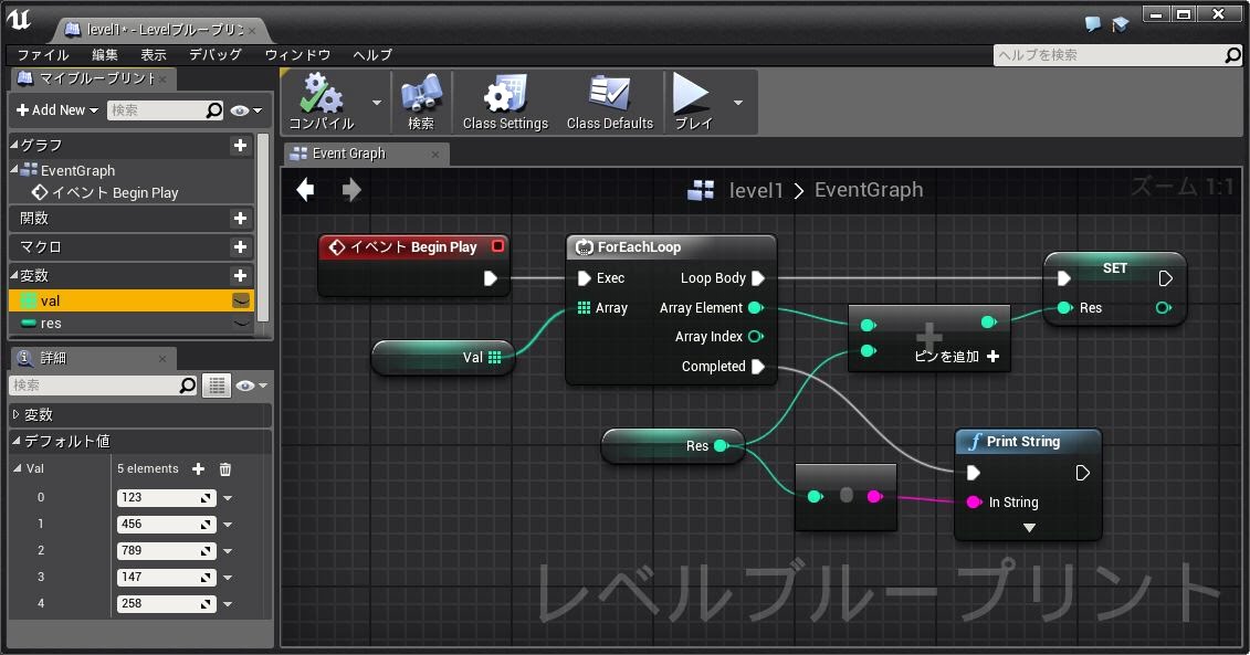 では、実際に配列を使ってみましょう。ここではForEachLoopを使い、配列に保管してあるすべての値を合計する処理を作ってみます。