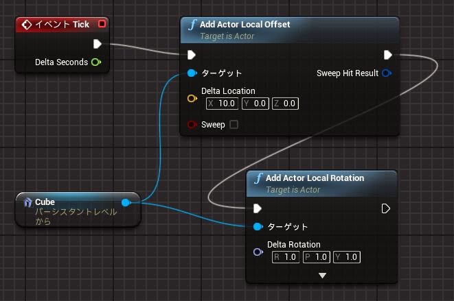 この例では、「Add Actor Local Offset」や「Add Actor Local Rotation」で設定した移動量は非常に小さな値です。それなのになぜなめらかにアクタが移動していったのかといえば、Tickにより、これらのノードが繰り返し呼びだされ続けたからです。