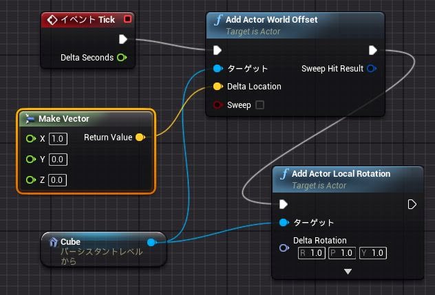 先ほどのサンプルを改良して動作を確かめてみましょう。「Make Vector」ノードを作成し、3つの入力項目を「X:1.0」「Y:0.0」「Z:0.0」とそれぞれ設定します。そして「Return Value」を、「Add Actor World Offset」の「Delta Location」につなぎます。