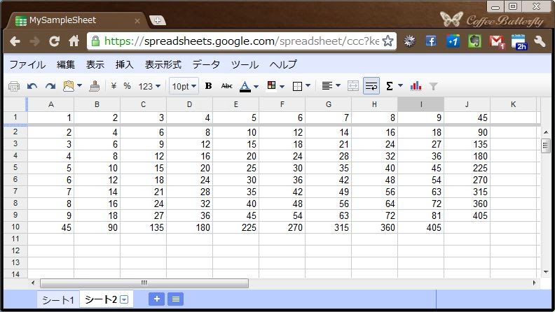 }getRangeで横・縦の位置を指定し、setValueで値を設定します。このように、Rangeの取得とgetValue/setValueさえわかれば、意外と簡単にセルを操作することができます。この後、縦横の合計を計算するのも、基本的には同様です。for (var i = 1;i < 10;i++)の繰り返しの中で、for (var j = 1;j < 10;j++){