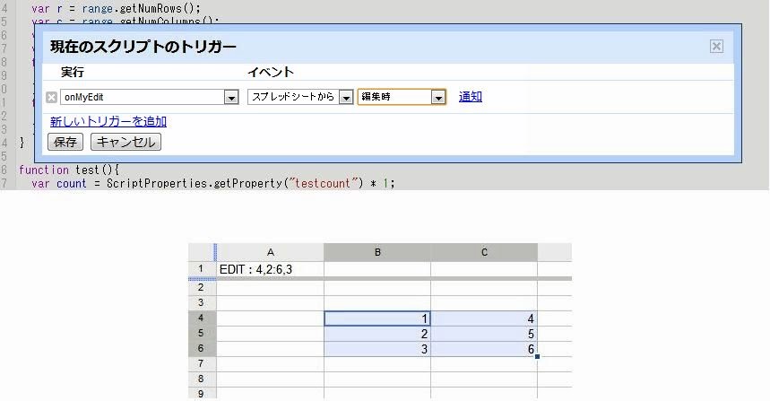 onEdit用のサンプル関数です。編集すると、最後に編集した範囲を示す値がA1セルに書き出されます。実際に<トリガー>メニューを使い、この関数を