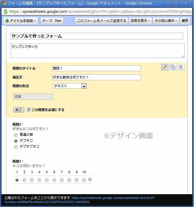 実際に、適当に質問を作ってみてください。今回は、後でフォームを利用する関係上、質問のタイトルは、それぞれ「質問1」「質問2」「質問3」としておいてください。それ以外は好きに設定してかまいません。