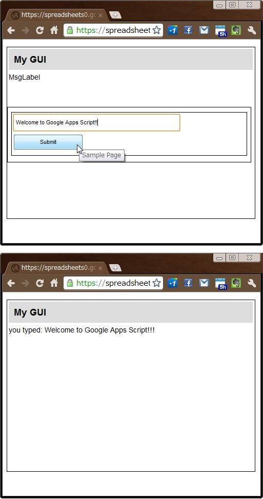 var str = e.parameter.strBox1;続いて、送信されたテキストをとり出します。フォームの送信内容は、引数の「parameter」というプロパティ内にまとめられています。ここでは「strBox1」という値をとり出しています。このようにparameter内には、フォームに配置したコンポーネントの名前でそれぞれの値が保管されています。