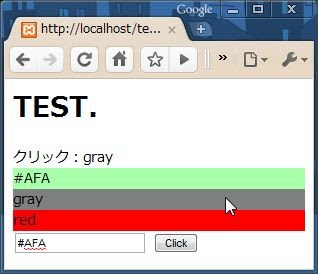 div.click(doClick);作成した<div>要素のオブジェクトには、このようにしてonclickのイベント処理を設定しています。これにより、クリックするとdoClickの関数が呼び出されるようになります。