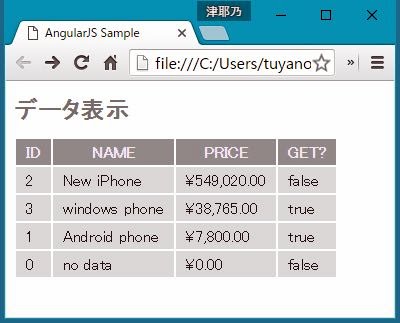 orderBy: 項目名先程の例で使ったものですね。これは、指定の項目を使って配列を並べ替えるものです。コロンの後に項目名を指定します。このとき、名前の前に半角マイナス記号(-)をつけると、逆順に並べ替えます。例えば、'price'ならpriceが小さいものから順になりますが、'-price'だと大きいものから順になります。