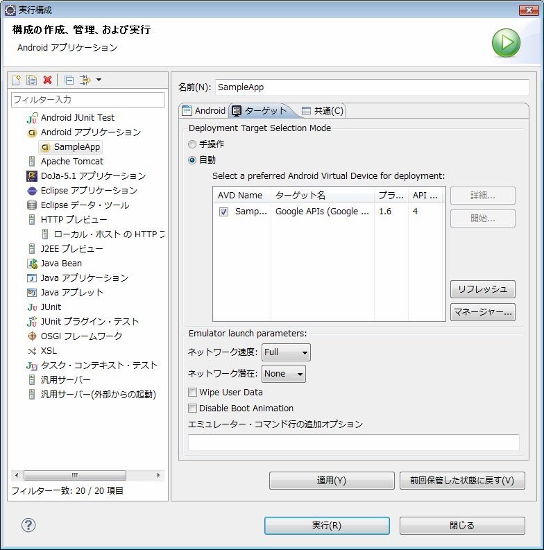 これでOKです。「適用」ボタンを押せば、変更が保存されます。そのまま「実行」ボタンを押してもいいですし、ウインドウを終了し、<実行><実行>メニューから、作成した<SampleApp>メニューを選んでも、プロジェクトを実行することができます。
