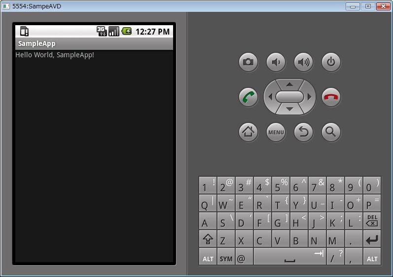 見ればわかるように、エミュレータには、androidの基本的なプログラムもちゃんと入っていて、それぞれ(一部例外もありますが)ちゃんと動きます。まずはエミュレータを使って、いろいろとプログラムを動かしてみましょう。もちろん、作成したSampleAppもね!