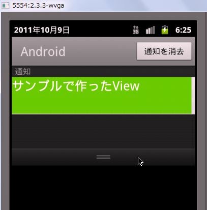 【Notification】.contentIntent =【PendingIntent】;これでOKです。下のリスト欄に独自の表示を行うノーティフィケーションの例を挙げておきました。ここでは、item.xmlというファイルを作成してレイアウトを用意し、これを利用することにしています。実際にitem.xmlにレイアウトを配置して試してみましょう。オリジナルの表示ができるというのは、なかなか面白いですよ!