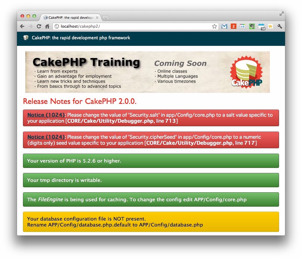 http://localhost/cake2/アクセスすると、どのように表示されたでしょうか。いくつもの赤や黄色、緑のメッセージが表示されたはずです。これは信号と同じで緑は「問題なし」、黄色は「注意」、そして赤は「ダメ」という意味です。