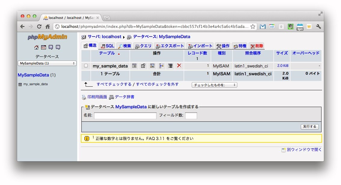 http://localhost/phpmyadmin/ここで「新規データベースを作成する」というところにデータベース名を入力し、「作成」ボタンを押せば、新しいデータベースが作られます。続いて現れる画面で、「データベース MySampleData に新しいテーブルを作成する」というところにテーブル名と項目数を入力し、「実行する」ボタンを押すと、テーブルの各項目を設定する画面になるので、ここでそれぞれの項目の設定を行い、テーブルを作成します。