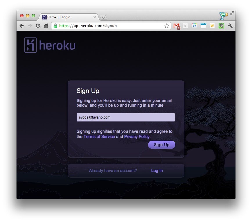 Thanks for signing up with Heroku! You must follow this link to activate your account: の下にあるリンクをクリックすると、Webブラウザが起動し、「